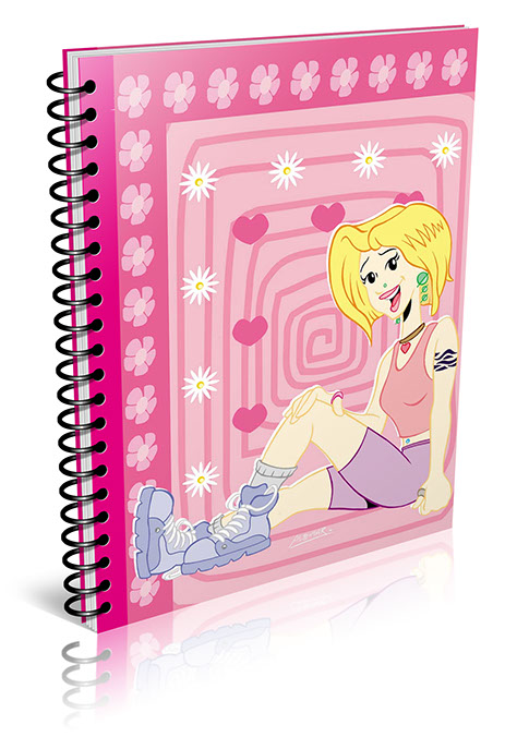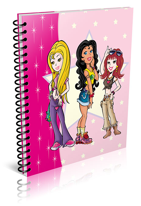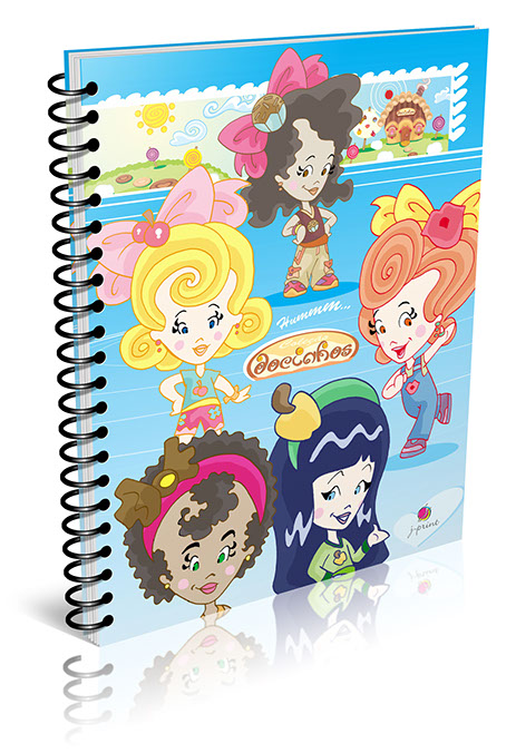 Arte para capa de caderno universitário da licença "As Charmosas" para a empresa Toten. Lápis, Photoshop, Ilustrator e Corel Draw.