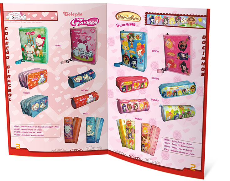 Página de catálogo de artigos de papelaria da licença Coleção Girassol e Docinhos. Foto, ilustrações, vetor, Indesing e Corel Draw.