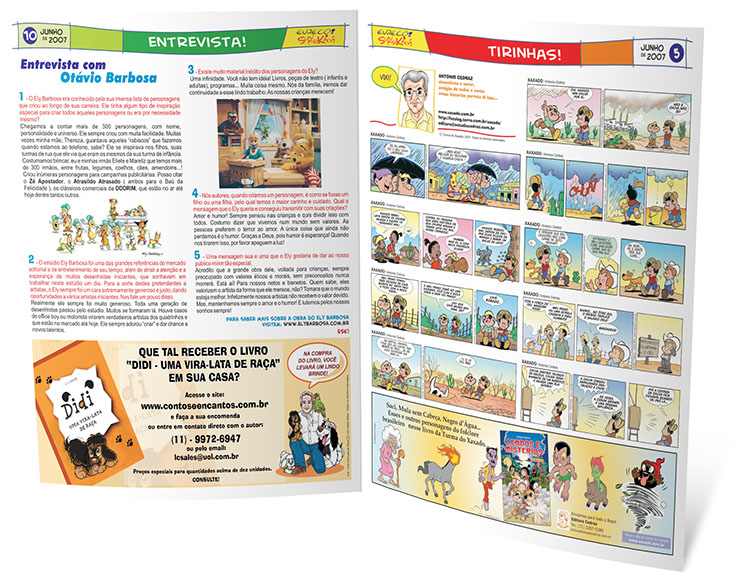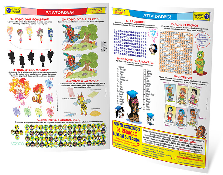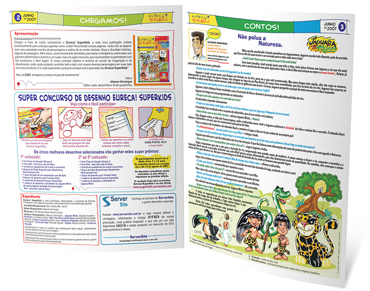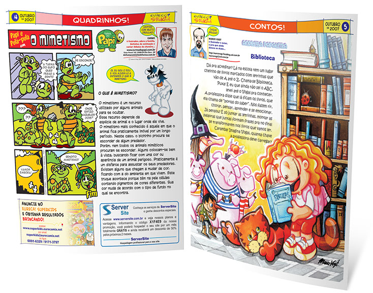 Páginas 10 e 5 do jornal infantil "Eureca! Superkids" #1, Eureca!, 2007.