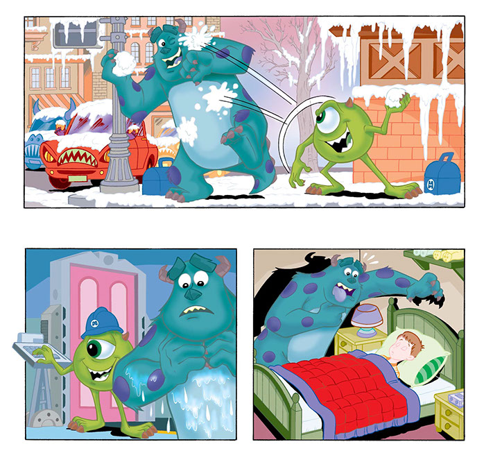 Colorização para arte de caderno de atividades "Monstros SA" pelo Magic Eyes Studio.