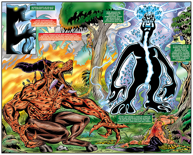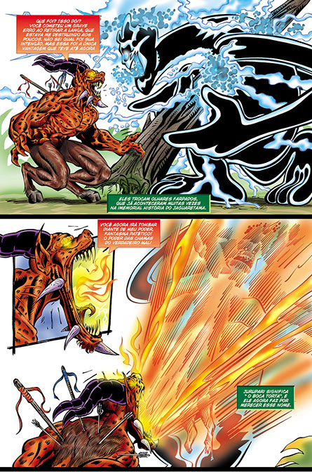 Página dupla 98/99 da HQ "Jaguara - Guerreira e Soberana", 2005, editora Via Lettera. Lápis, nanquim, Photoshop com letreiramento no Corel Draw.