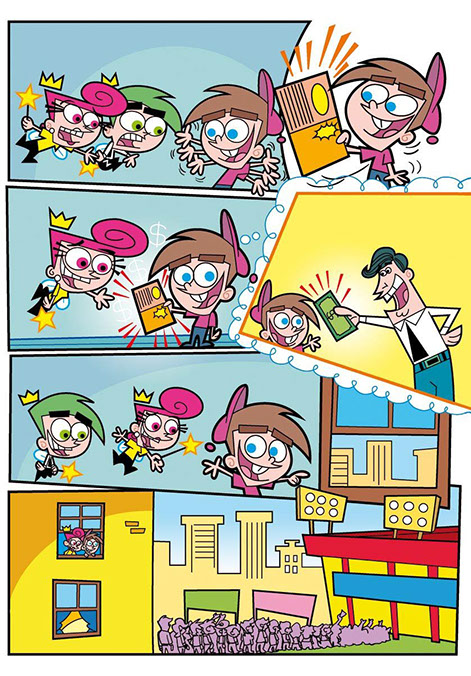 Página da HQ "Padrinhos Mágicos" para revista Recreio.
