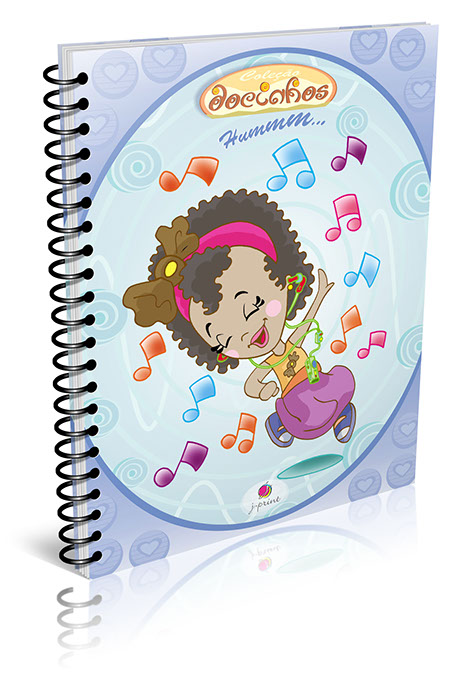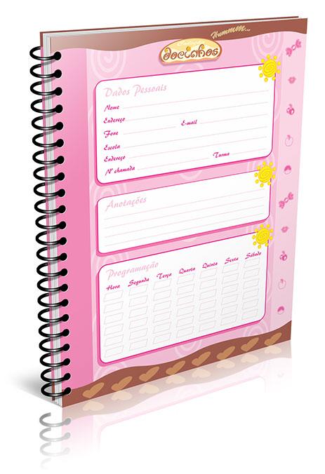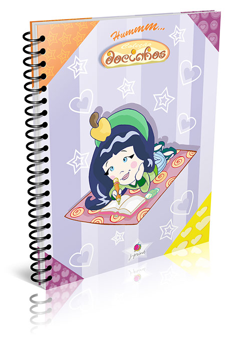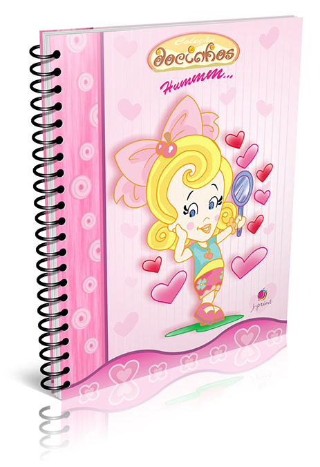 Arte para folha de informações de caderno universitário da licença "Coleção Docinhos" para a empresa J. Print. Lápis, Photoshop, Ilustrator e Corel Draw.