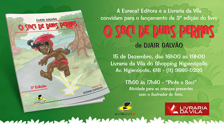 Convite para o lançamento do livro "O Saci de Duas Pernas", pela Eureca! Editora na Livraria da Vila, Shopping Higienópolis ocorrido em 15/12/2012.