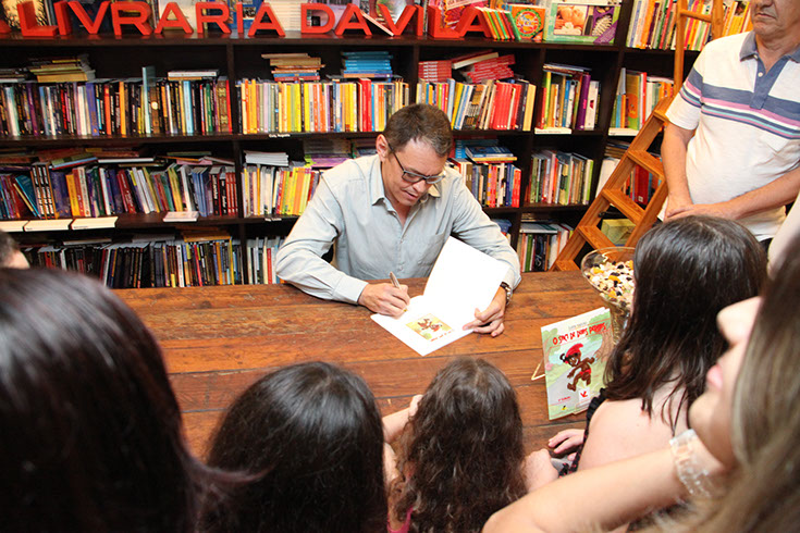 No detalhe: o autor autografando um livro para uma leitora mirim.