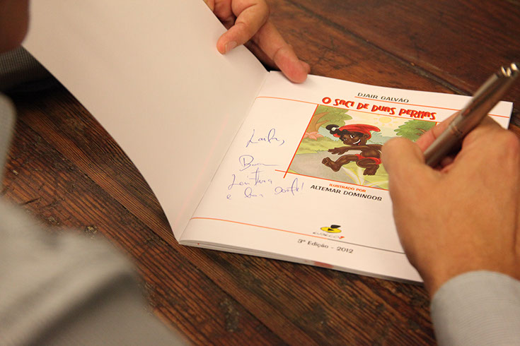 Djair Galvão autografando para o ilustrador Marco Bala.